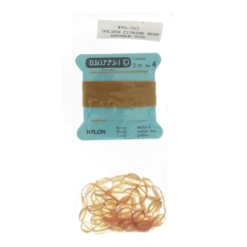 This product is a unique one. These high-grade Golden Citrine beads, with a clear center-drill due to Citrine's natural translucency, revealing the thread inside, are shaped in baroque ovals measuring roughly 7x9-mm, but with some variation in size and elongation. The pre-threaded beads also come packaged with a length of Griffin 2-m no-4 nylon bead cord in a complementary pumpkin color.